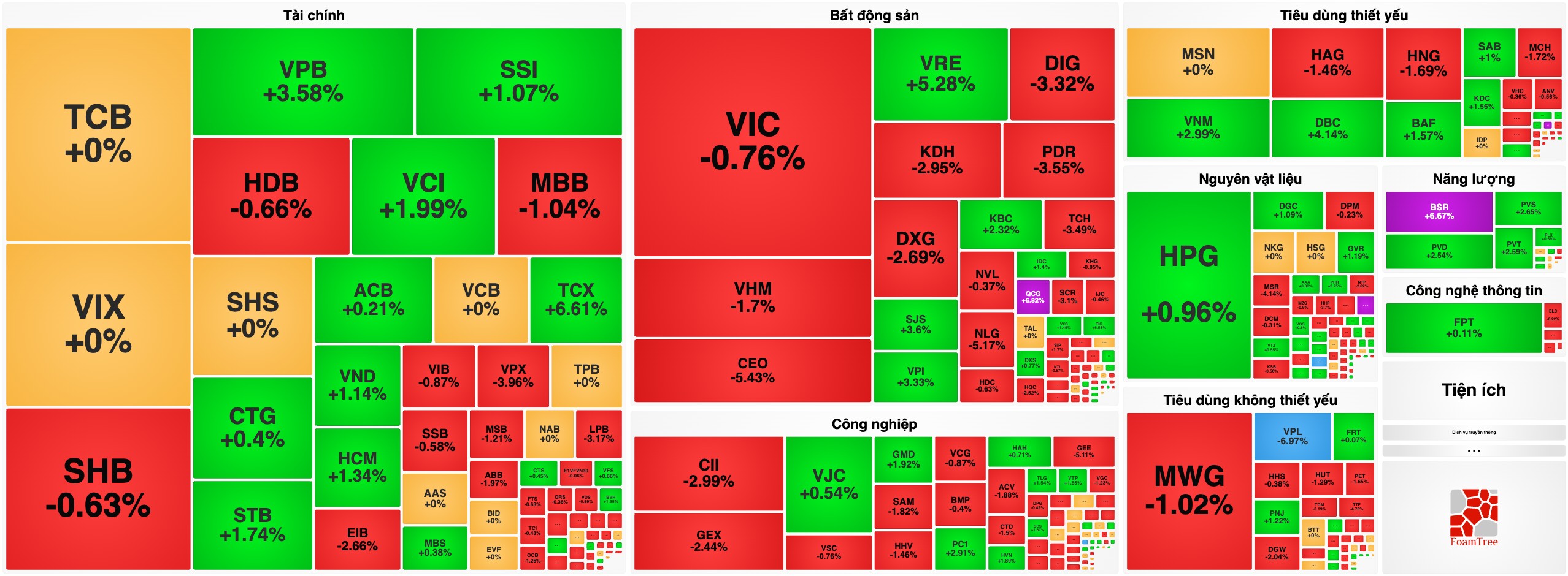 Nhóm Năng lượng & Chứng khoán (Điểm sáng): Nhóm Năng lượng bứt phá với BSR (+6,67%), POW (+3,9%), PVD (+2,54%). Nhóm Chứng khoán cũng phục hồi tốt với TCX (+6,61%), VCI (+1,99%), HCM (+1,34%), dù tân binh VPX giảm 4%.