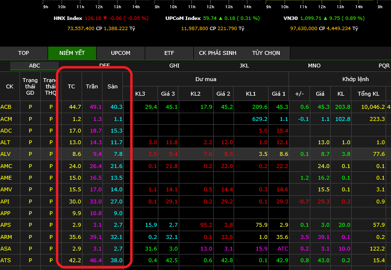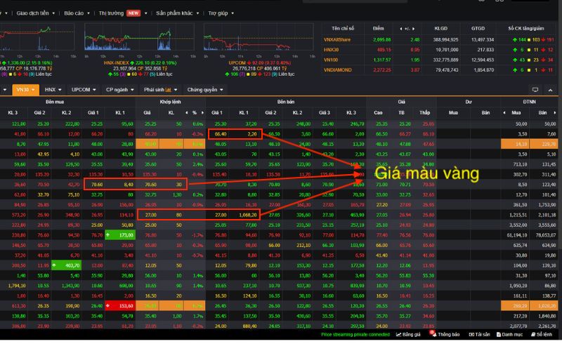 Ví dụ: Nếu hôm qua cổ phiếu VCB đóng cửa giá 90.000 đồng, thì sáng nay giá tham chiếu màu vàng sẽ là 90.000 đồng. Nếu khớp lệnh ở giá này, con số sẽ hiện màu vàng.