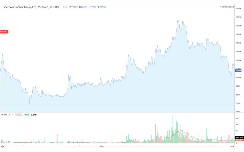 - Năm 2019 (+4.55%): Giá cổ phiếu GVR bắt đầu hồi phục nhẹ và đi ngang tích lũy. Sự kiện quan trọng nhất là việc GVR chuẩn bị hồ sơ chuyển sang niêm yết tại Sở Giao dịch Chứng khoán TP.HCM (HOSE), mở ra kỳ vọng mới.