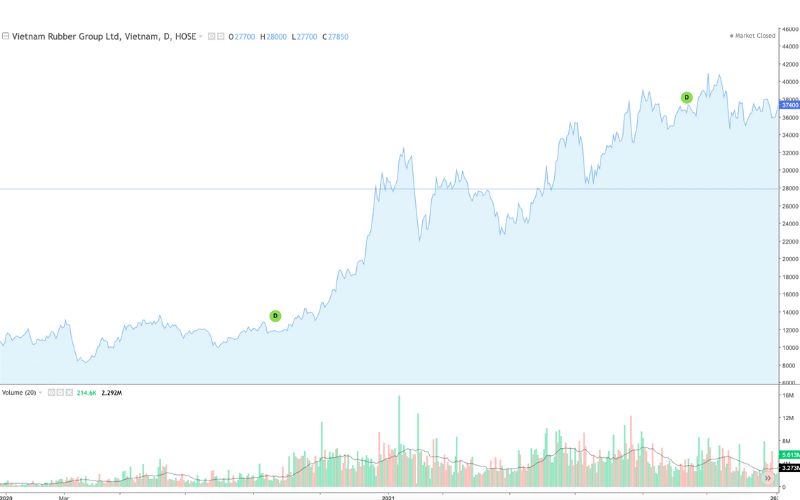 - Năm 2021 (+25.38%): Đà tăng tiếp diễn, đưa cổ phiếu GVR lập đỉnh lịch sử 41,050đ vào tháng 11/2021.