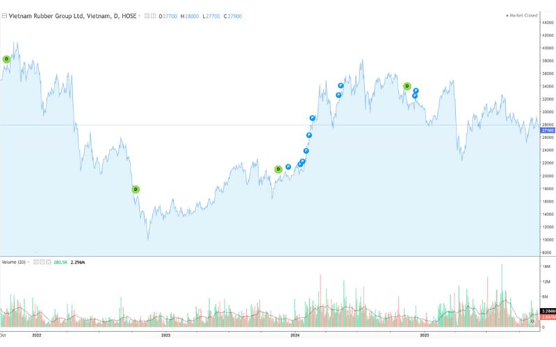 + Cuối năm: Giá cổ phiếu GVR hồi phục nhẹ và đóng cửa quanh mức 27,700đ (Tháng 11). Đây được xem là vùng giá cân bằng để chuẩn bị cho chu kỳ mới.