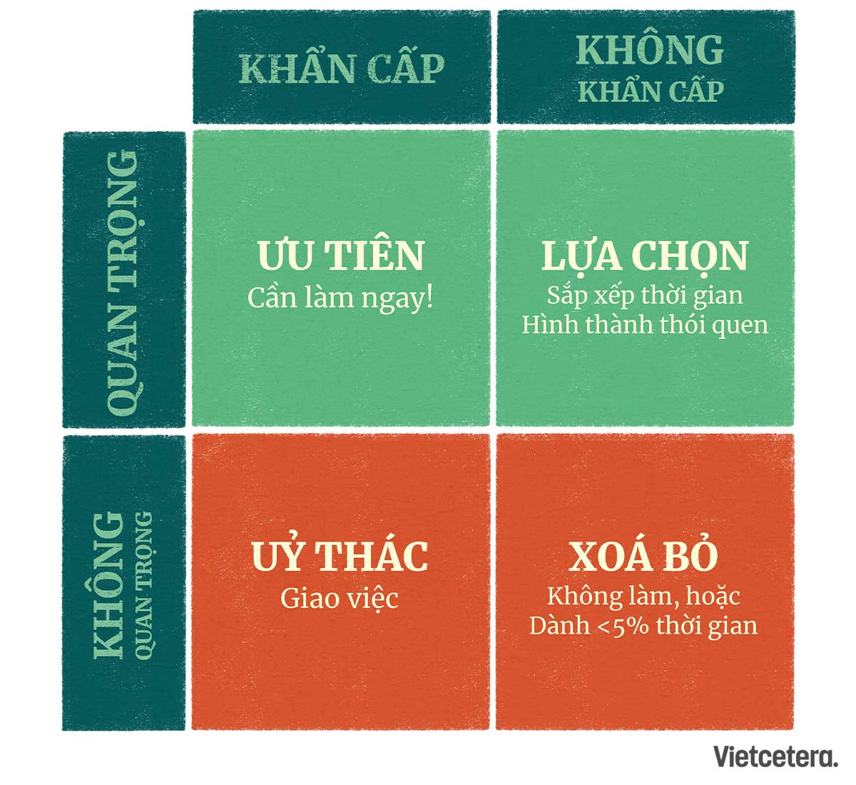 | IV | Không quan trọng & Không khẩn cấp | Lướt mạng, xem video vô định | Loại bỏ (ELIMINATE) |