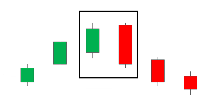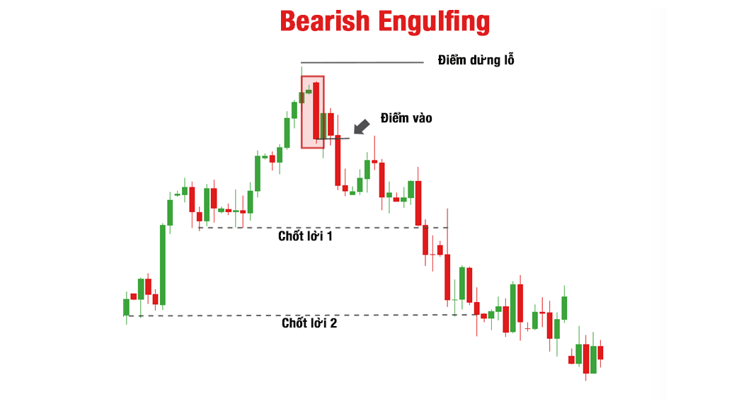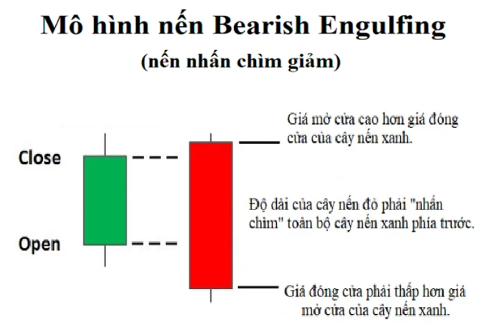 - Nến giảm giá (đỏ) có thân lớn đã bao trùm và nhấn chìm hoàn toàn thân nến tăng giá (xanh/lục) ngay trước đó.