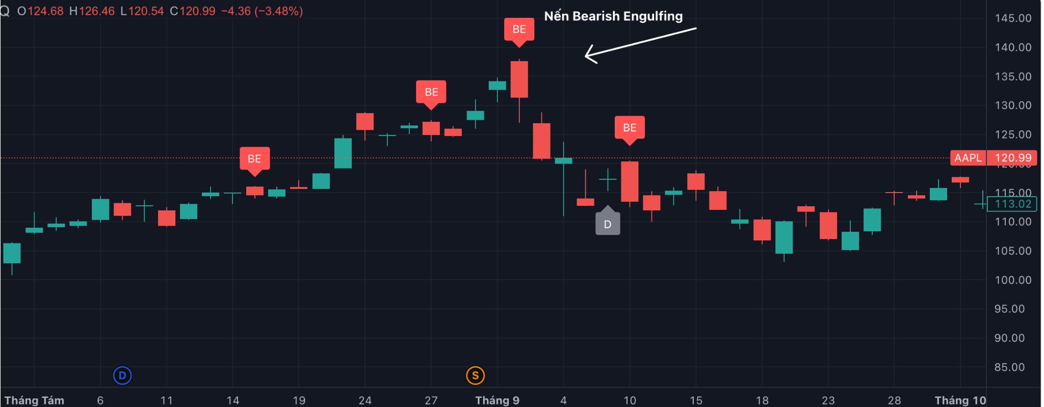 Để hiểu hơn về cách mô hình nến đảo chiều Bearish Engulfing này hoạt động, bạn có thể quan sát ví dụ sau trên biểu đồ cổ phiếu Apple (AAPL):