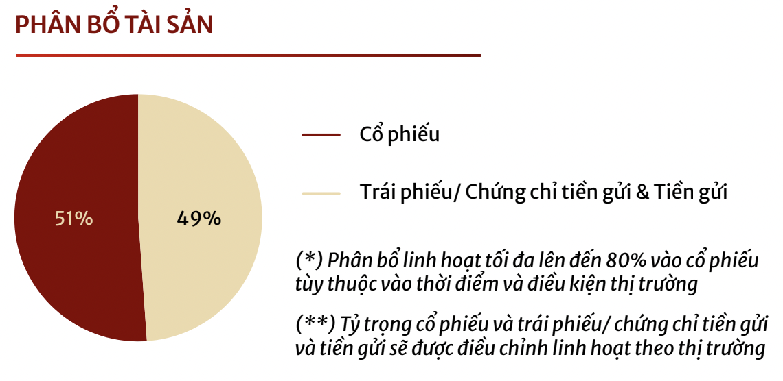Việc phân bổ luôn tuân thủ các giới hạn theo quy định. Khi thị trường thuận lợi: Quỹ có thể nâng tỷ trọng cổ phiếu lên đến 80% danh mục, tập trung vào các cơ hội tăng trưởng nổi bật. Phần còn lại được phân bổ vào các tài sản thu nhập cố định như tiền mặt, tiền gửi, trái phiếu… để duy trì độ ổn định.