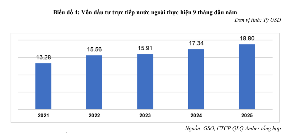 - Dòng vốn FDI “chảy xiết”: Bất chấp bất ổn toàn cầu, vốn FDI thực hiện vào Việt Nam 9 tháng đầu 2025 đạt 18.8 tỷ USD, tăng 8.5%. Sự dịch chuyển chuỗi cung ứng toàn cầu (đặc biệt là ngành bán dẫn) và việc nâng cấp đối tác chiến lược với các cường quốc đang biến Việt Nam thành “công xưởng mới” của thế giới.