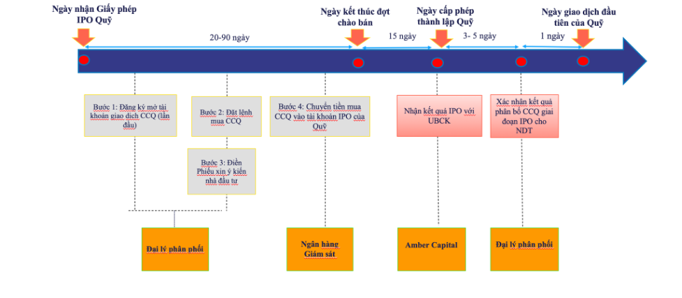 + Giai đoạn nhận Giấy phép: Sau khi Ủy ban Chứng khoán Nhà nước (UBCKNN) cấp “Giấy chứng nhận đăng ký chào bán chứng chỉ quỹ ra công chúng”, Công ty Quản lý Quỹ Amber sẽ chính thức công bố bản thông báo chào bán trong thời hạn 05 ngày làm việc.