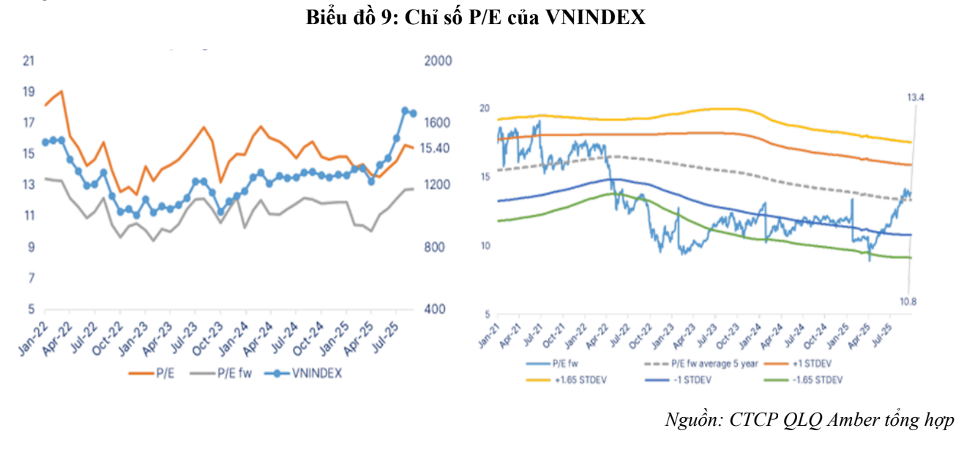 - Định giá VN-Index hấp dẫn: Kết thúc quý III/2025, chỉ số P/E của toàn thị trường đang ở mức khoảng 15.0 lần. Đây là mức định giá khá rẻ so với trung bình 5 năm (khoảng 17x) và cực kỳ hấp dẫn khi so sánh với các thị trường trong khu vực như Thái Lan, Malaysia, Indonesia.